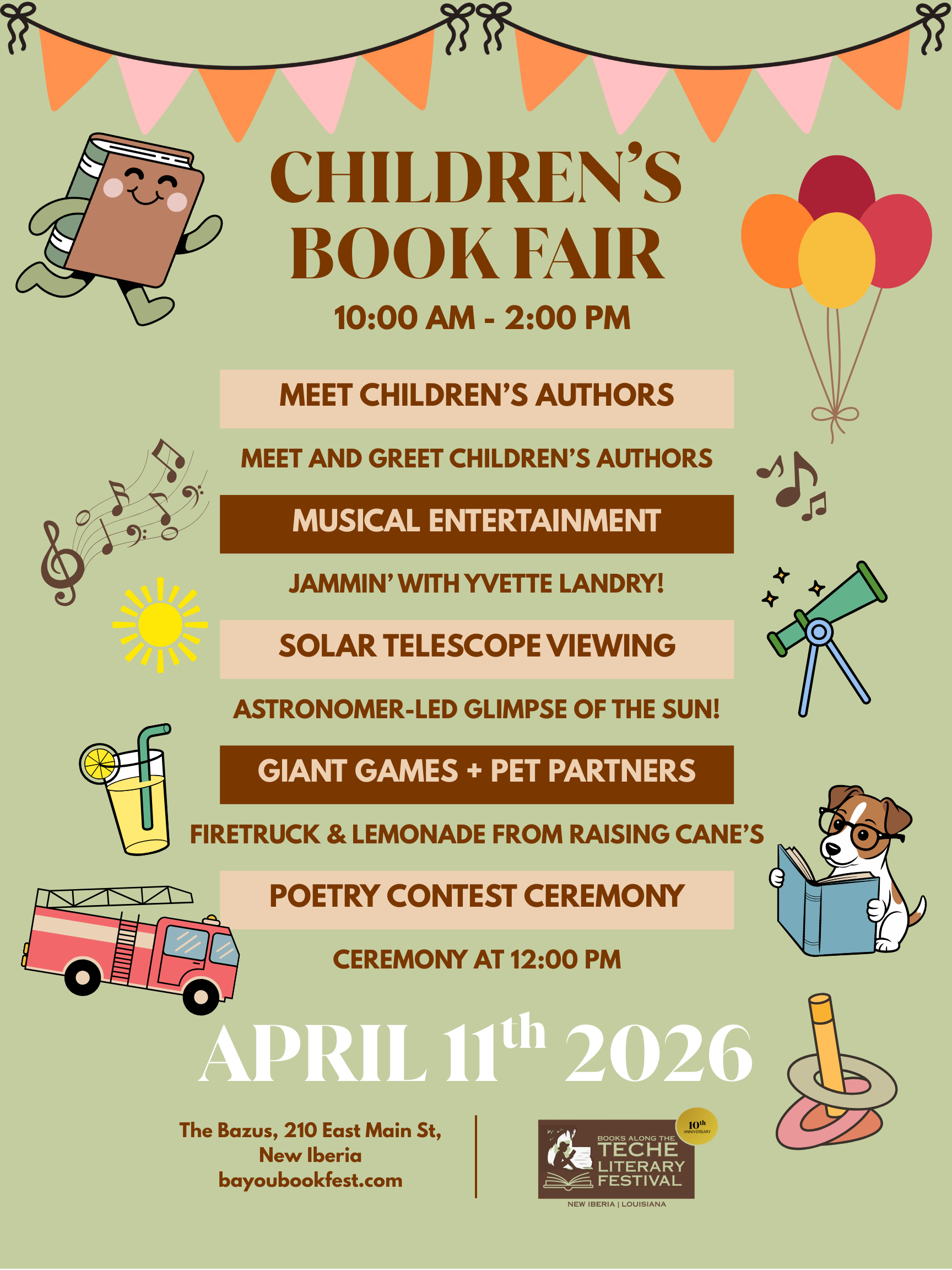Bring your family for a fun-filled day at the Children’s Book Fair! Meet a variety of children’s book authors and explore their stories, enjoy games and hands-on activities, and listen to lively music by Cajun artist Yvette Landry. Kids can interact with costumed characters, and food trucks will be on site for everyone to enjoy. It’s a perfect day for families to celebrate reading, creativity, and community!